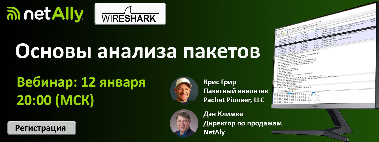 В среду 12 января в 20:00 (по МСК) приглашаем присоединиться к первой части бесплатных обучающих курсов из цикла "Основы анализа пакетов при помощи WireShark". Цикл вебинаров организован компаниями Packet Pioneer, LLC и NetAlly.