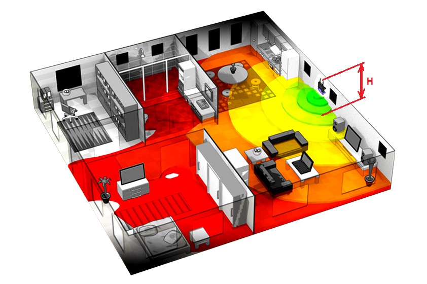 Красная зона — плохое качество сигнала беспроводной сети. В комнате без цветового выделения связи с точкой доступа нет вообще. Высота точки доступа над полом существенно влияет на картину покрытия.
