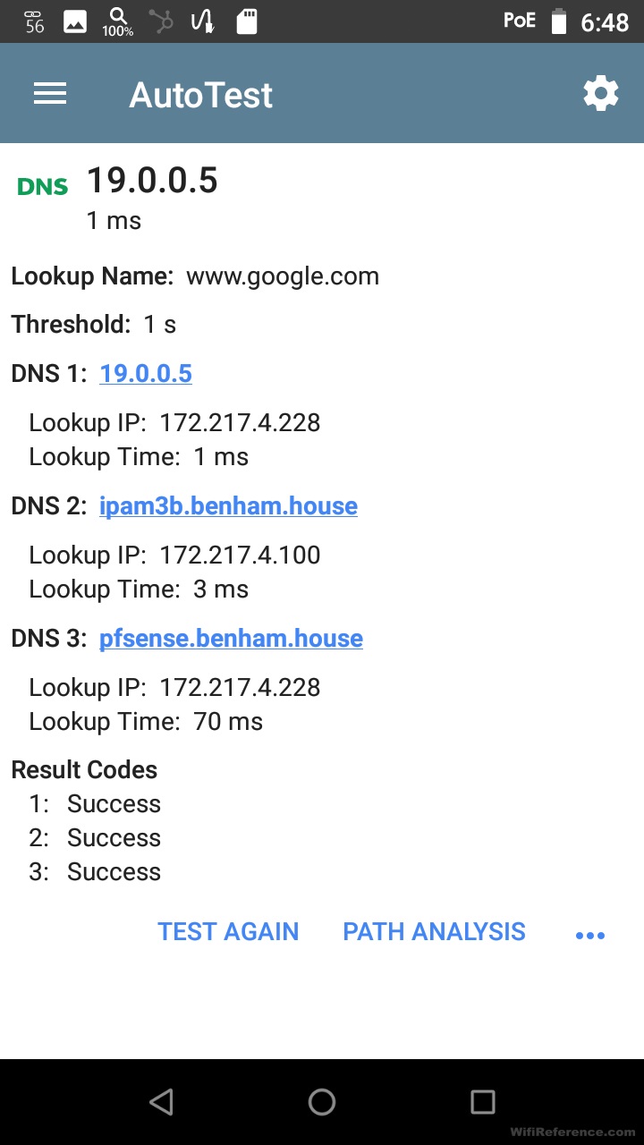 Функция автоматического тестирования EtherScope nXG также предоставляет вам подробную информацию о DNS. В этом случае он выполнил общедоступный поиск DNS с каждым из трех DNS-серверов, назначенных через DHCP.