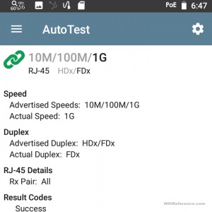 - Вы также должны были уже запустить автотест (подробнее об автоматических тестах позже) с профилем проводной сети, который проходит тест PoE для определения доступности PoE. Это означает, что тест PoE должен быть включен и настроен с использованием класса Powered Device, который поддерживается вашим коммутатором и имеет достаточную мощность для зарядки EtherScope nXG. Мне пришлось немного повозиться с этим, прежде чем мне это удалось.
